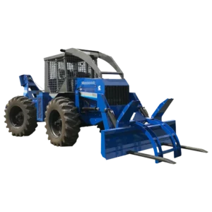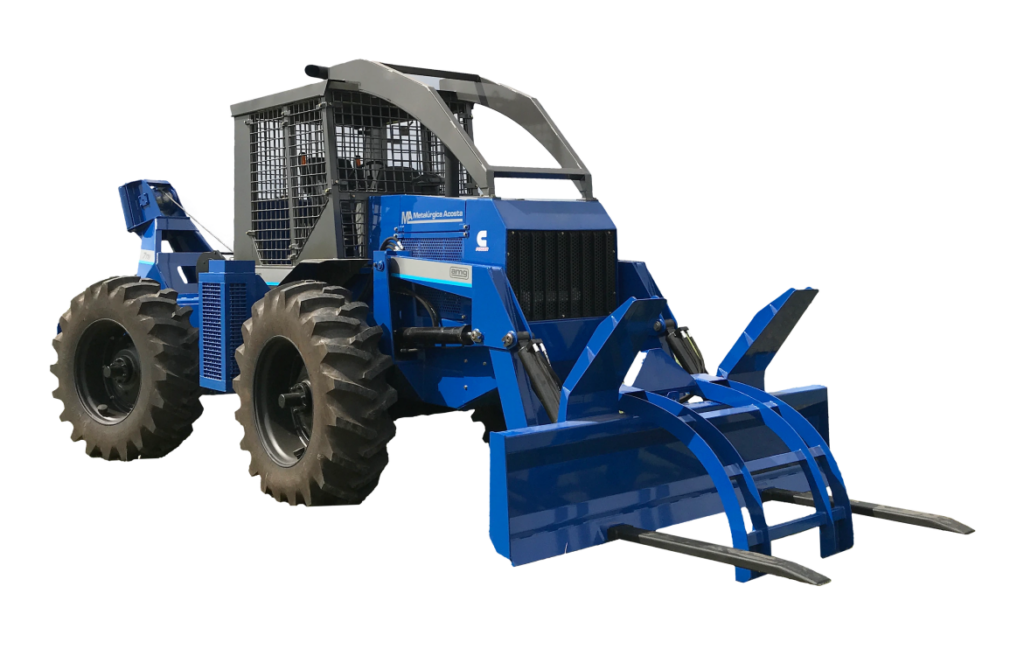 Motoarrastrador 4×4, de ruedas iguales, con articulación central y eje trasero pivotante, lo que permite una gran maniobrabilidad y excelente adaptación a todo tipo de terreno. Esta unidad ha sido especialmente desarrollada para trabajos en explotaciones forestales, ya que posee guinche hidráulico, garra posterior de arrastre y pala frontal para carga y descarga de troncos.