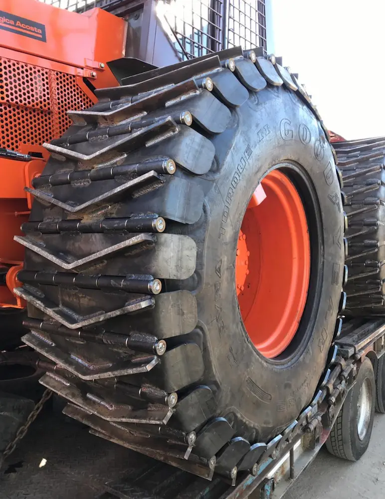 construidos en chapa de 1/2″ o 5/8″ de espesor, bujes de acero de 42 mm. de diámetro, pernos (ejes) de Acero 1045 de 25 mm. de diámetro, tacos de Acero 1045 de 5/8″ x 1 3/4″; con medio eslabón extra para hermanar.